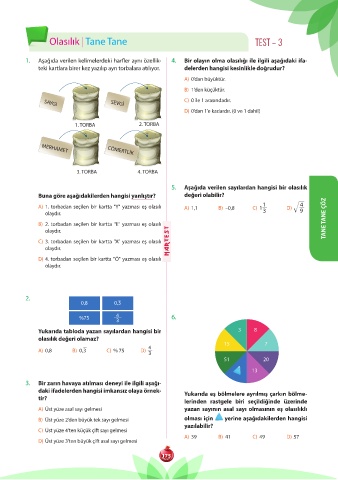 1. Aşağıda verilen kelimelerdeki harfler aynı özellik- 4. Bir olayın olma olasılığı ile ilgili aşağıdaki ifa-