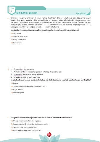 7. Aşağıdaki cümlelerin hangisinde “mutluluk”u anlatan bir söz kullanılmamıştır?