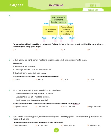 5. Şapkalı mantar, küf mantarı, maya mantarı ve parazit mantarı olmak üzer dört çeşit mantar vardır.