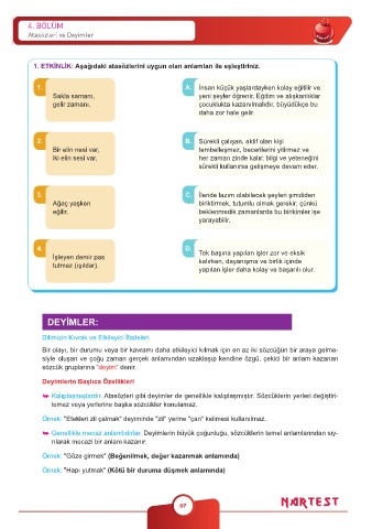 1. ETKİNLİK: Aşağıdaki atasözlerini uygun olan anlamları ile eşleştiriniz.