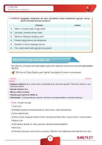 2. ETKİNLİK: Aşağıdaki cümlelerde altı çizili sözcüklerin anlam özelliklerini (gerçek, mecaz,