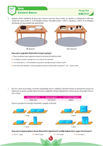 7. Katı bir cismin bulunduğu zeminde oluşturduğu basıncı etkileyen faktörleri deney ile göstermek isteyen bir