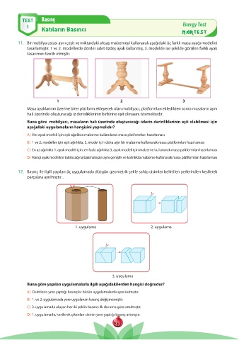 11. Bir mobilya ustası aynı çeşit ve miktardaki ahşap malzemeyi kullanarak aşağıdaki üç farklı masa ayağı modelini