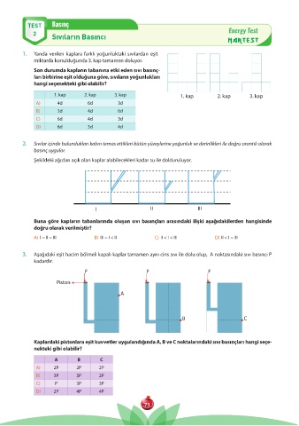 1. Yanda verilen kaplara farklı yoğunluktaki sıvılardan eşit