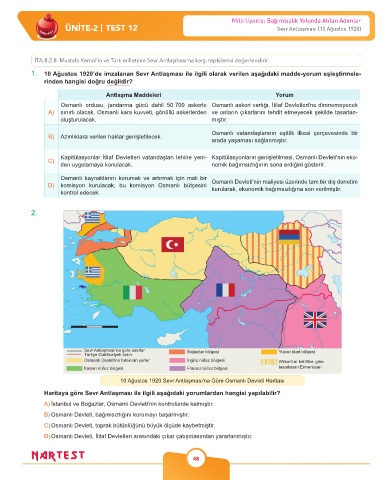 1. 10 Ağustos 1920’de imzalanan Sevr Antlaşması ile ilgili olarak verilen aşağıdaki madde-yorum eşleştirmele-