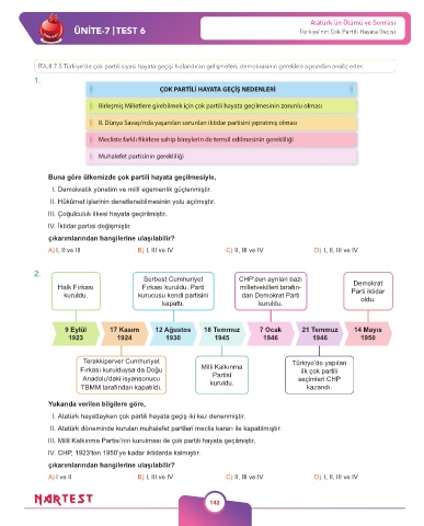 ÜNİTE-7 | TEST 6 Türkiye'nin Çok Partili Hayata Geçişi