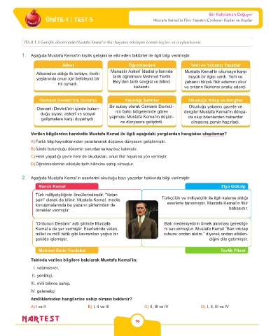 ÜNİTE-1 | TEST 5 Mustafa Kemal'in Fikir Hayatını Etkileyen Kişiler ve Olaylar
